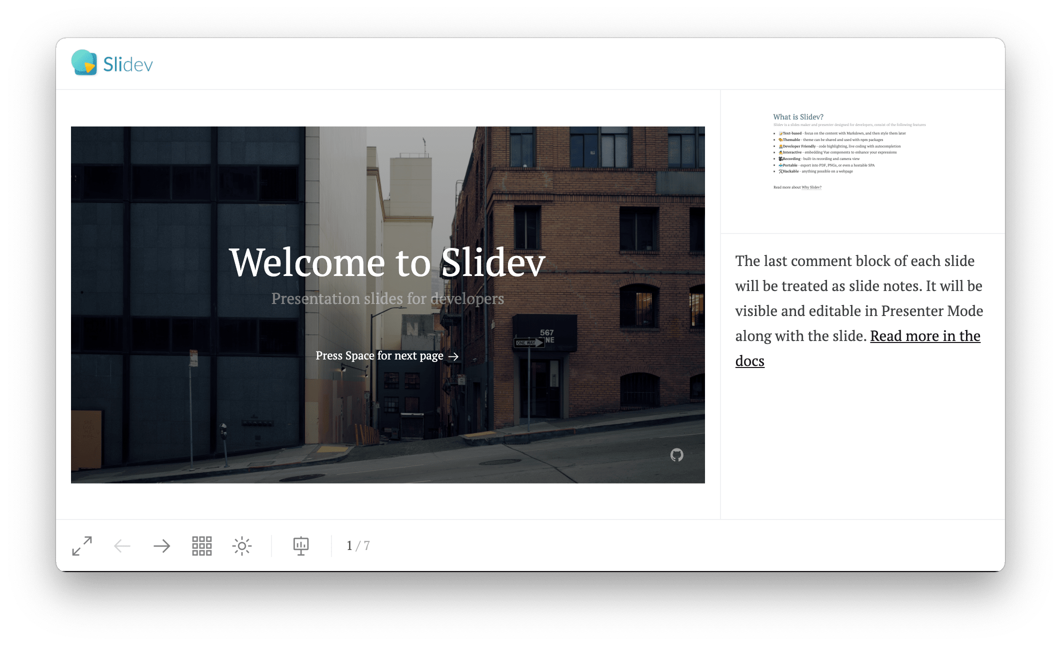 To enter the presenter mode, you can click the button in the navigation panel, or visit http://localhost:<port>/presenter